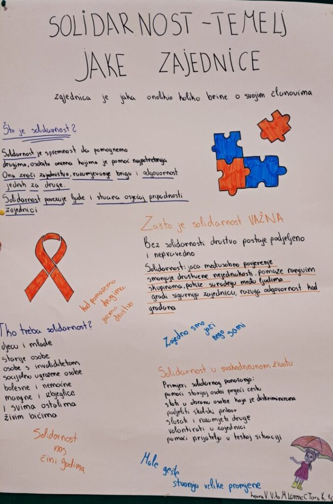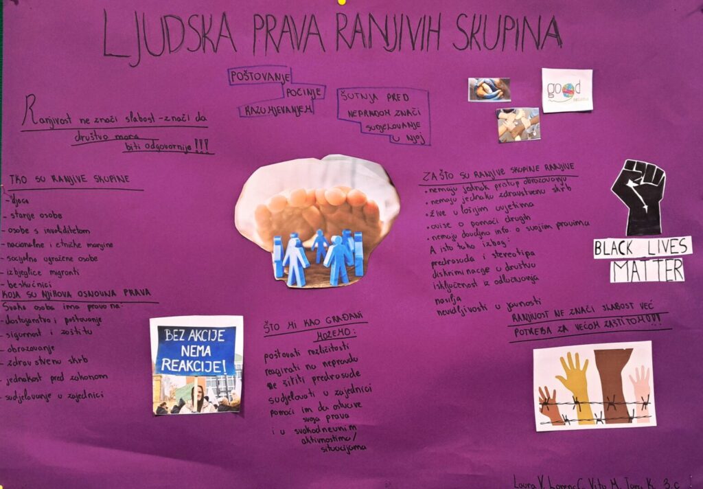 Nakon rasprave o ljudskim pravima ranjivih skupina, kao i o odgovornom uključivanju svih ključnih aktera, ZAG-ovci su izradili plakate kojima žele potaknuti učenike na odgovornost, empatiju i aktivnost. Teme koje smo obradili su: tko su ranjive skupine u društvu, koja su njihova ljudska prava, kako mi kao građani možemo pomoći ranjivim skupinama, zašto su ranjive skupine ranjive, zašto je solidarnost važna te tko treba našu zaštitu i pomoć. Zaključak je bio da je solidarnost temelj jake zajednice i da je zajednica onoliko jaka koliko brine o svojim članovima.