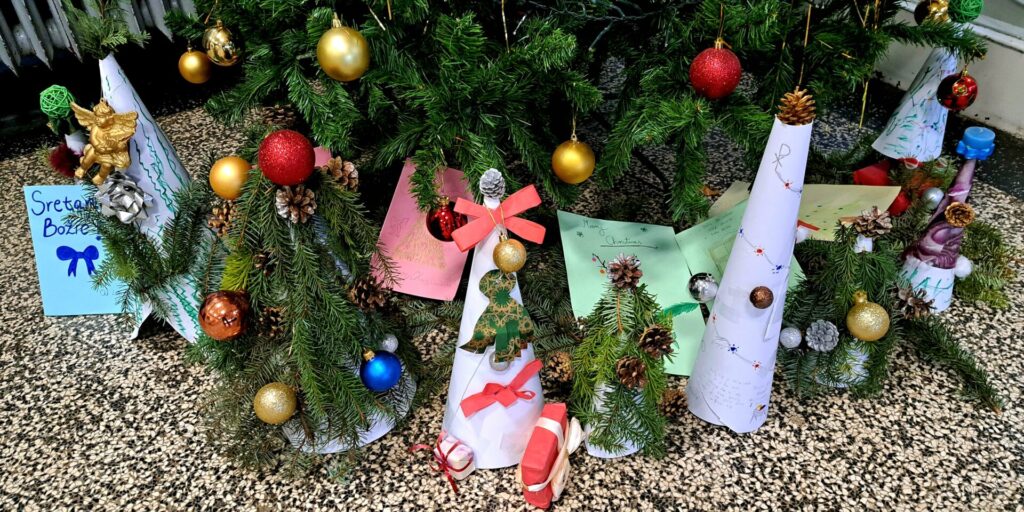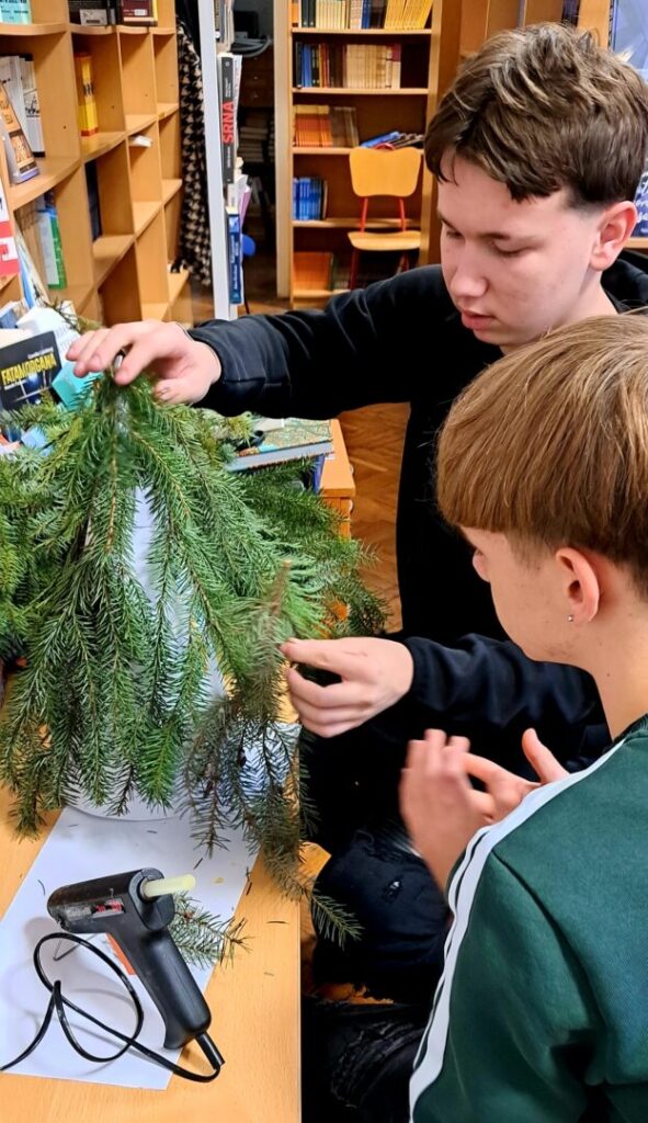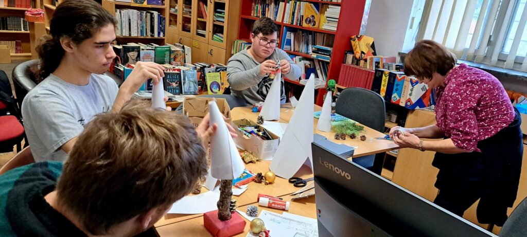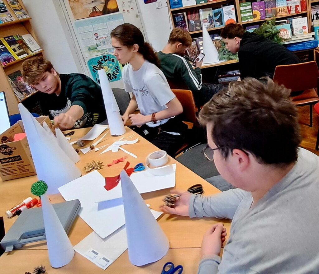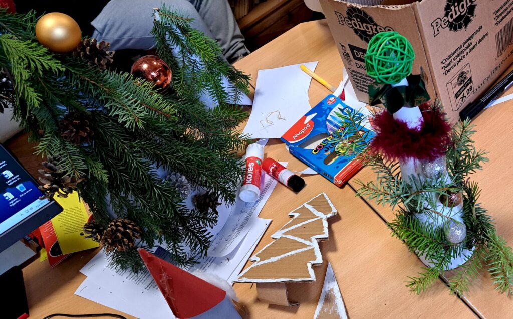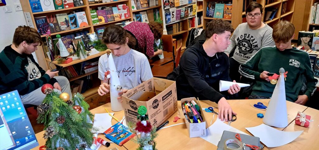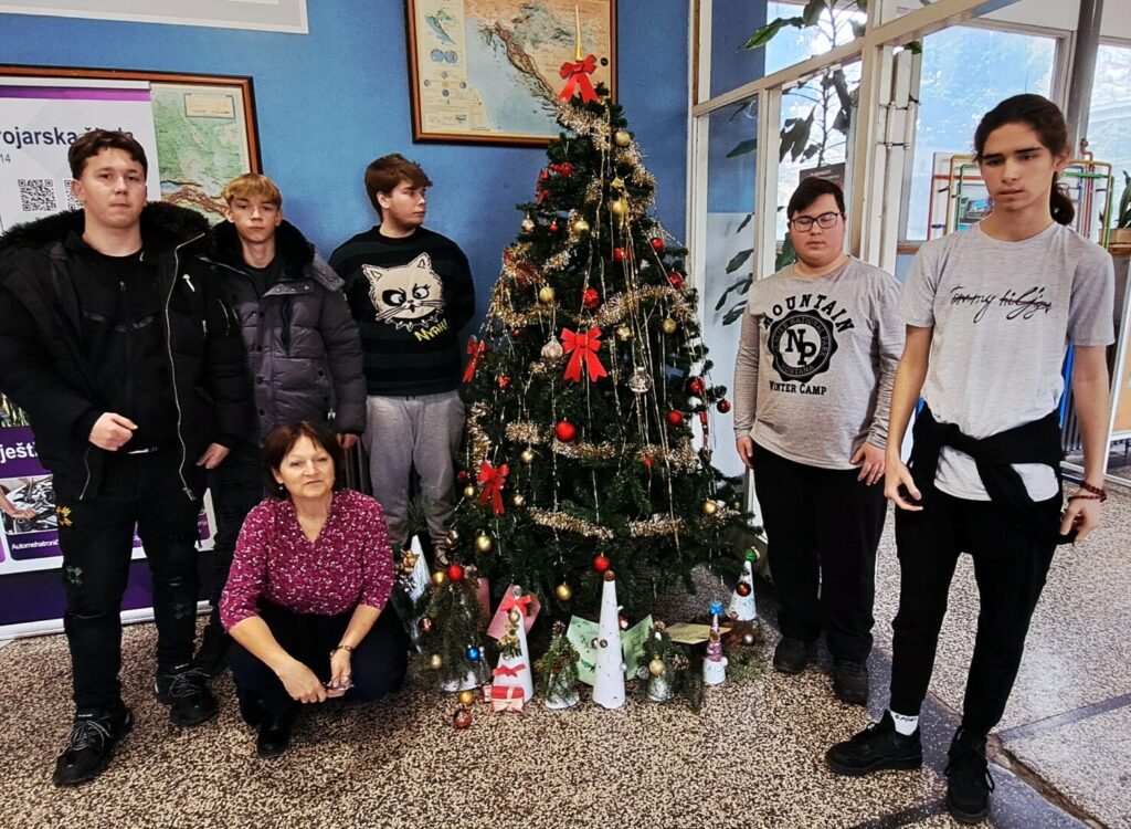 Kao i svake godine, u povodu božićnih i novogodišnjih blagdana, organizirali smo u školskoj knjižnici kreativne božićne radionice. Učenici 2. c razreda, smjera alatničar i tehnički crtač, pokazali su svoju kreativnost i sudjelovanje u timskom radu. Pri izradi malenih borića, čestitki i ostalih božićnih ukrasa, učenici su se rukovodili ekološkim načelima i koristili reciklirajuće materijale (karton, papir, češere, grančice). Učenicima su se na radionici pridružili razrednica Ivana Šutalo Dujmenović te članovi Zajednice aktivnih građana. Ciljevi ovakvih radionica su poticanje maštovitosti i kreativnosti kod učenika te želje za timskim radom i zajedništvom u duhu adventa i Božića.