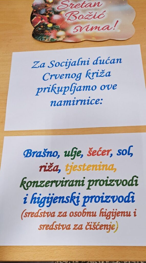 Pozivamo sve učenike i nastavnike da se odazovu humanitarnoj akciji jer svakim i malim prilogom činimo dobro djelo i radost najpotrebnijim osobama i obiteljima. Namirnice i proizvode ćemo prikupljati do 10. prosinca 2025., po potrebi i duže, a možete ih priložiti u kutije uz plakate u predvorju škole.