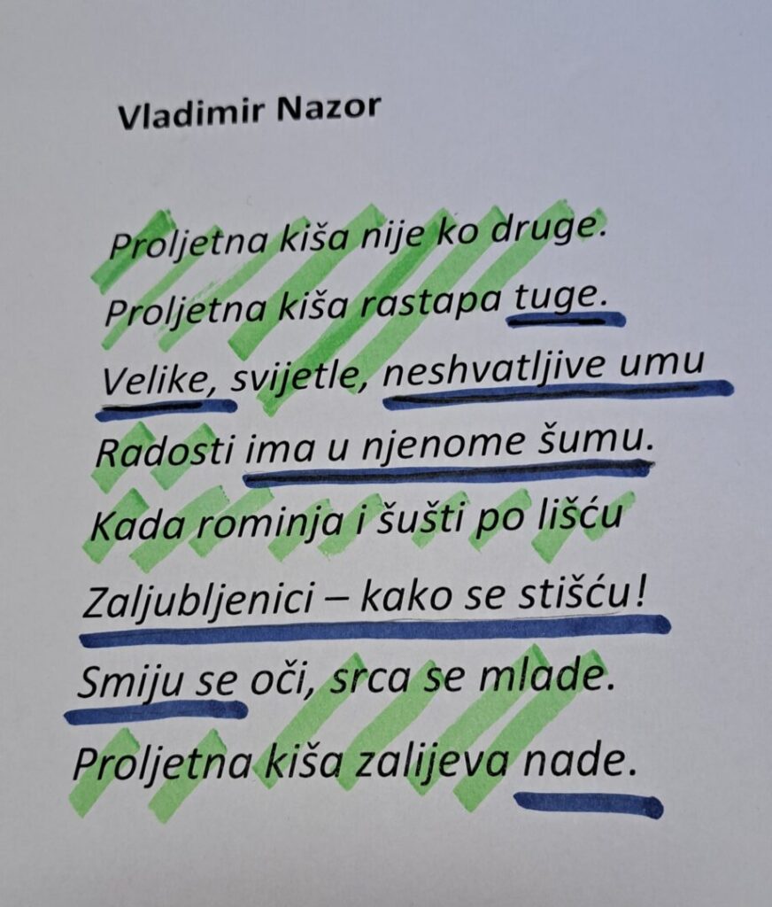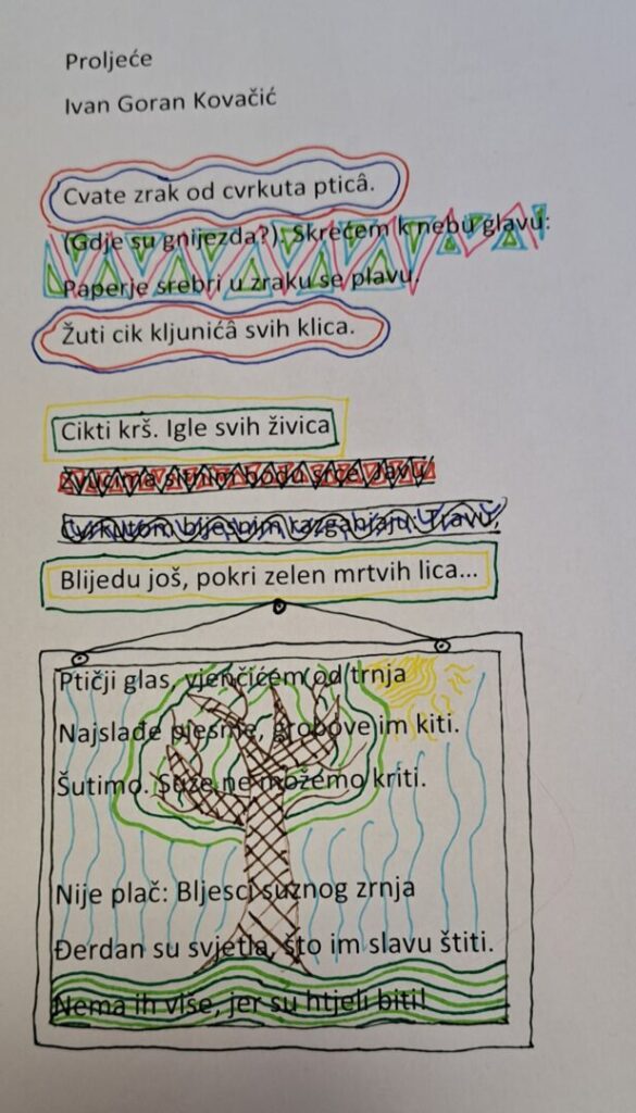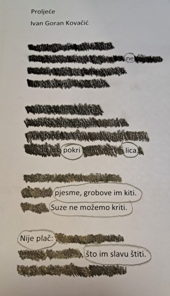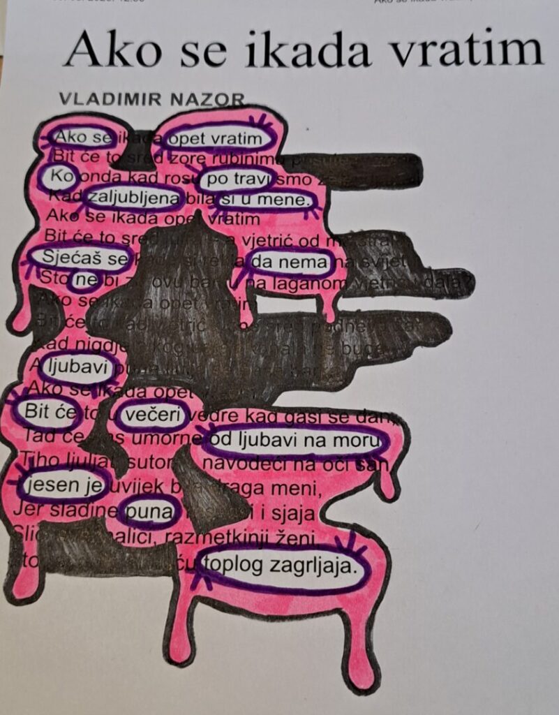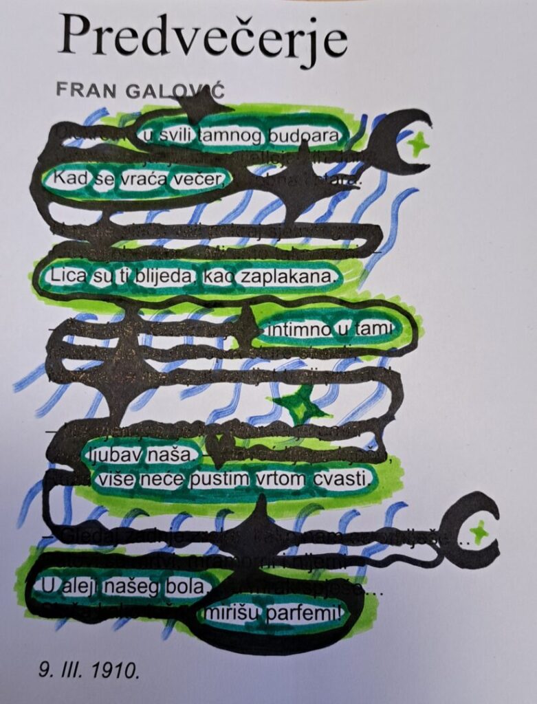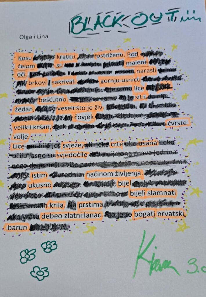 U povodu dolaska proljeća i buđenja prirode održane su u školskoj knjižnici radionice stvaranja „blackout“ poezije. To je zanimljiv, kreativan i suvremen umjetnički oblik književnog stvaralaštva koji može spojiti likovnu i pjesničku komponentu u nov umjetnički oblik. Blackout poezija nastaje prekrivanjem (zacrnjivanjem ili precrtavanjem) dijelova postojećeg teksta, ostavljajući vidljivim samo odabrane riječi koje tvore novu misao ili novu poetsku cjelinu. Moguće je spajati dijelove različitih riječi, riječi iz različitih rečenica ili pak cijele rečenice. Prozni tekst ili pjesmu je moguće samo zacrniti, ali i maštovitim precrtavanjem nepotrebnog teksta, moguće je dobiti nove likovne uratke. Učenici 2.c i 3. c razreda (tehnički crtači i alatničari) pokazali su da i oni mogu biti stvaratelji novih umjetničkih kreacija, novih pjesničkih slika i misaonih igri riječima, kao i maštovitih likovnih uradaka. Ovaj oblik stvaralaštva učenicima je blizak i privlačan jer se ne stvara iz ničega, već se otkriva skriveno značenje unutar postojećeg teksta te učenici sami donose odluku koje riječi zadržati u tekstu, a koje odbaciti. Ciljevi ovih radionica su: potaknuti kreativno i slobodno izražavanje učenika, razvijati osjećaj za jezik, ritam i značenje riječi, osnažiti samopouzdanje učenika u pisanju te potaknuti kritičko čitanje teksta. Osim toga, ciljevi su i čitanje i proučavanje poezije, osvješćivanje ljepote u pisanoj riječi te razvijanje kod učenika sposobnost da iz postojećeg naprave nešto novo i inovativno koristeći svoju maštu i iskustvo.